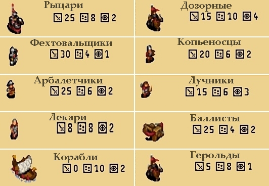 1. Очки движения. Определяют радиус движения воина. 2. Очки движения, обозначенные на игровом поле, показывают сколько будет стоить пересечение этого поля. 3. Очки обороны игрового поля повышают очки обороны воинов. 4. Цена воина или предводителя в золотых. 5. Боевая сила показывает среднюю силу воина. Она может повышаться или понижаться в бою против неравного противника. 6. Радиус видимости воина.